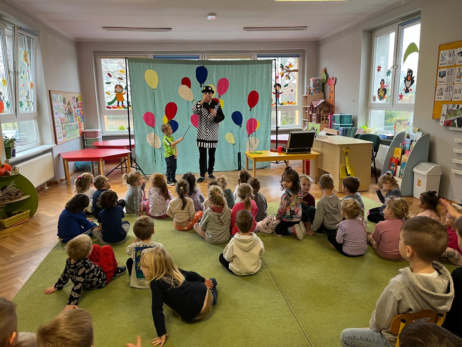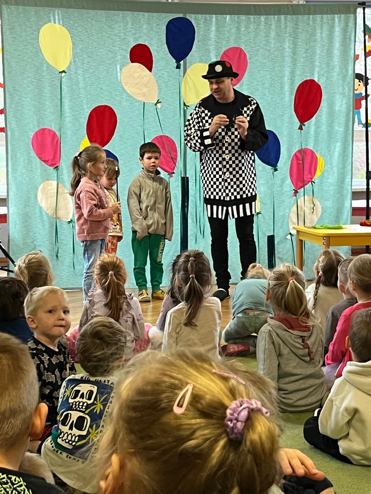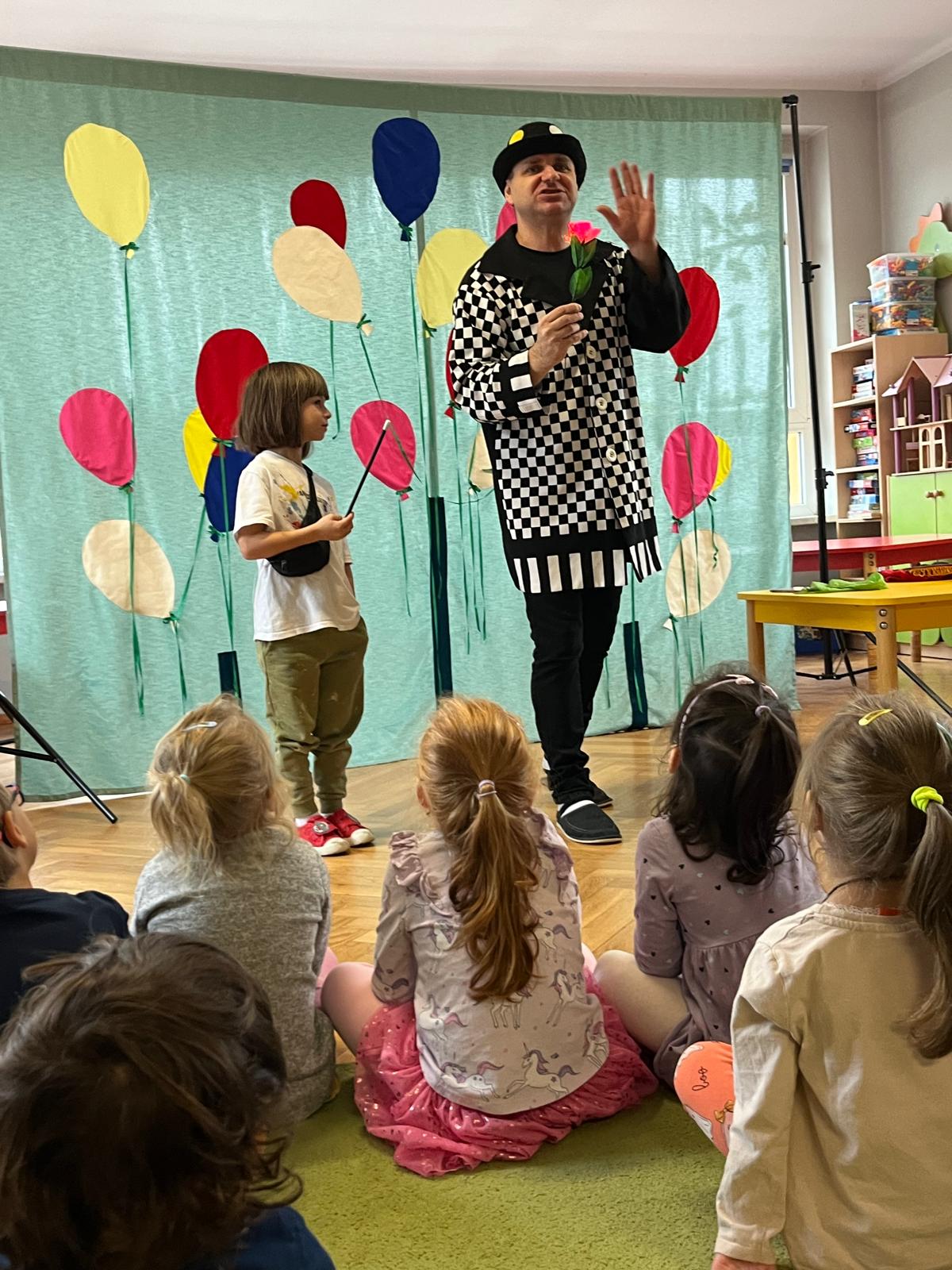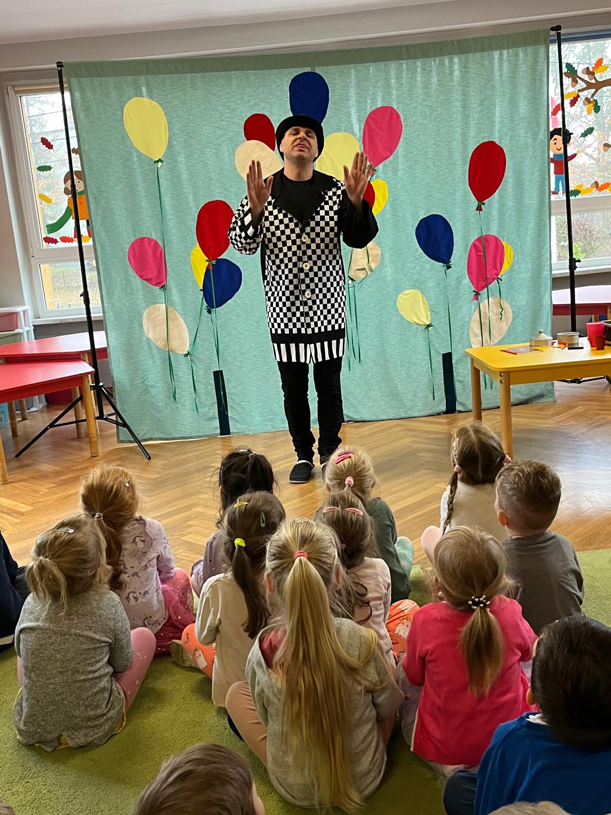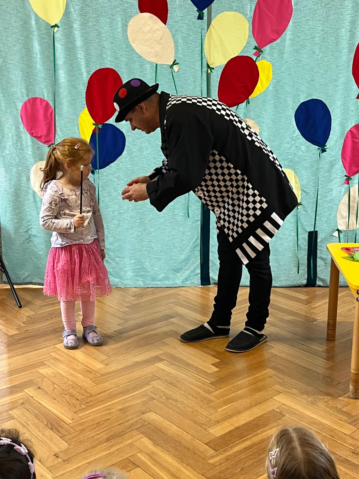 12 listopada 2024r. odwiedził nasze przedszkole niezwykły gość, który przeniósł dzieci w świat iluzji i czarów. Wyprawa do tajemniczego świata dostarczyła wszystkim sporo satysfakcji i radości. Dzieci miały możliwość przeżycia czegoś niezwykłego, ponieważ aktywnie uczestniczyły w przedstawieniu. Uczyły się tajemniczych zaklęć, a odważni ochotnicy pomagali mistrzowi w jego pokazie. Dzieci miały okazje podziwiać najróżniejsze sztuczki m. in. : z kartami, sznurkami, chustami i kwiatami.