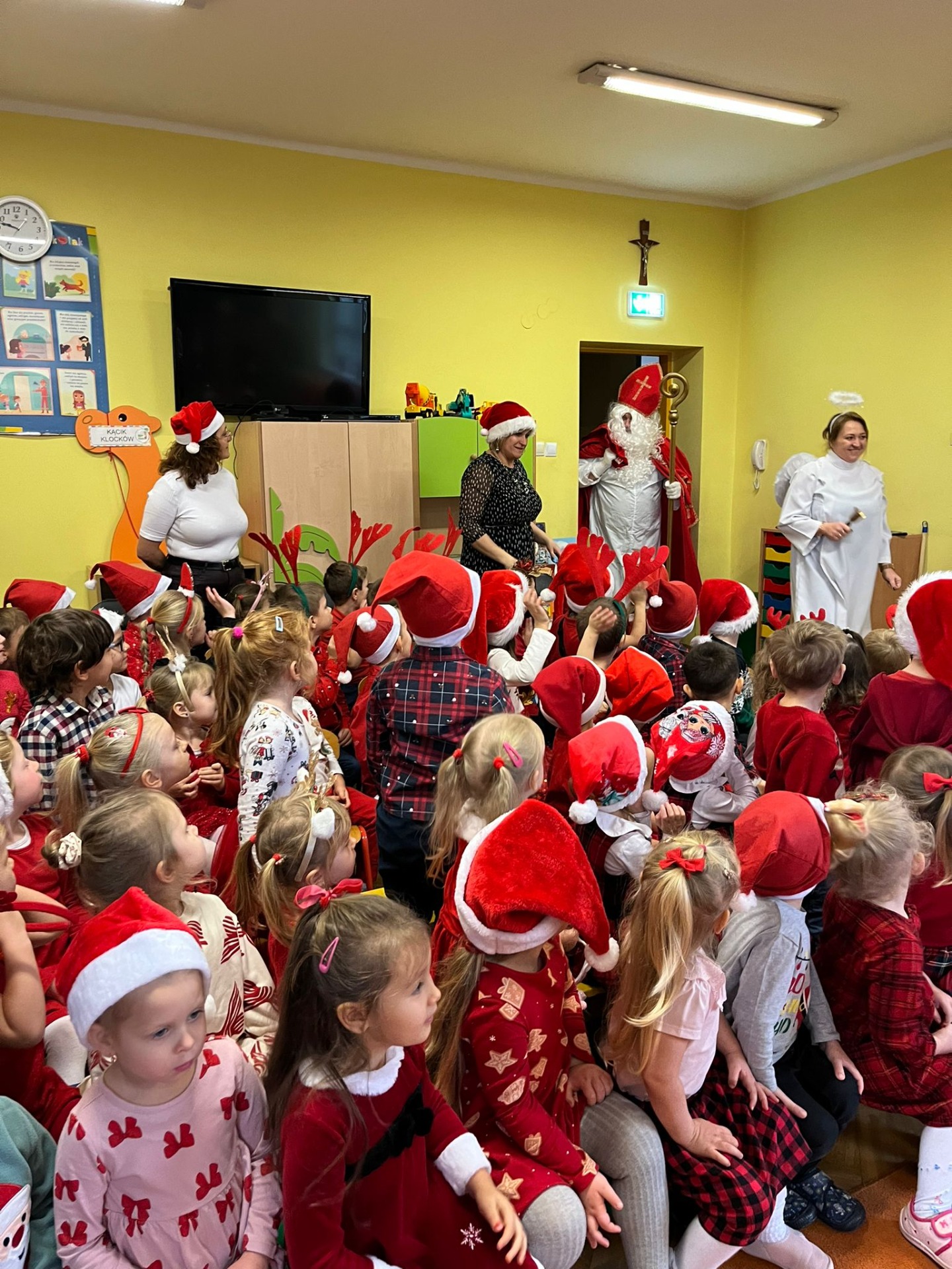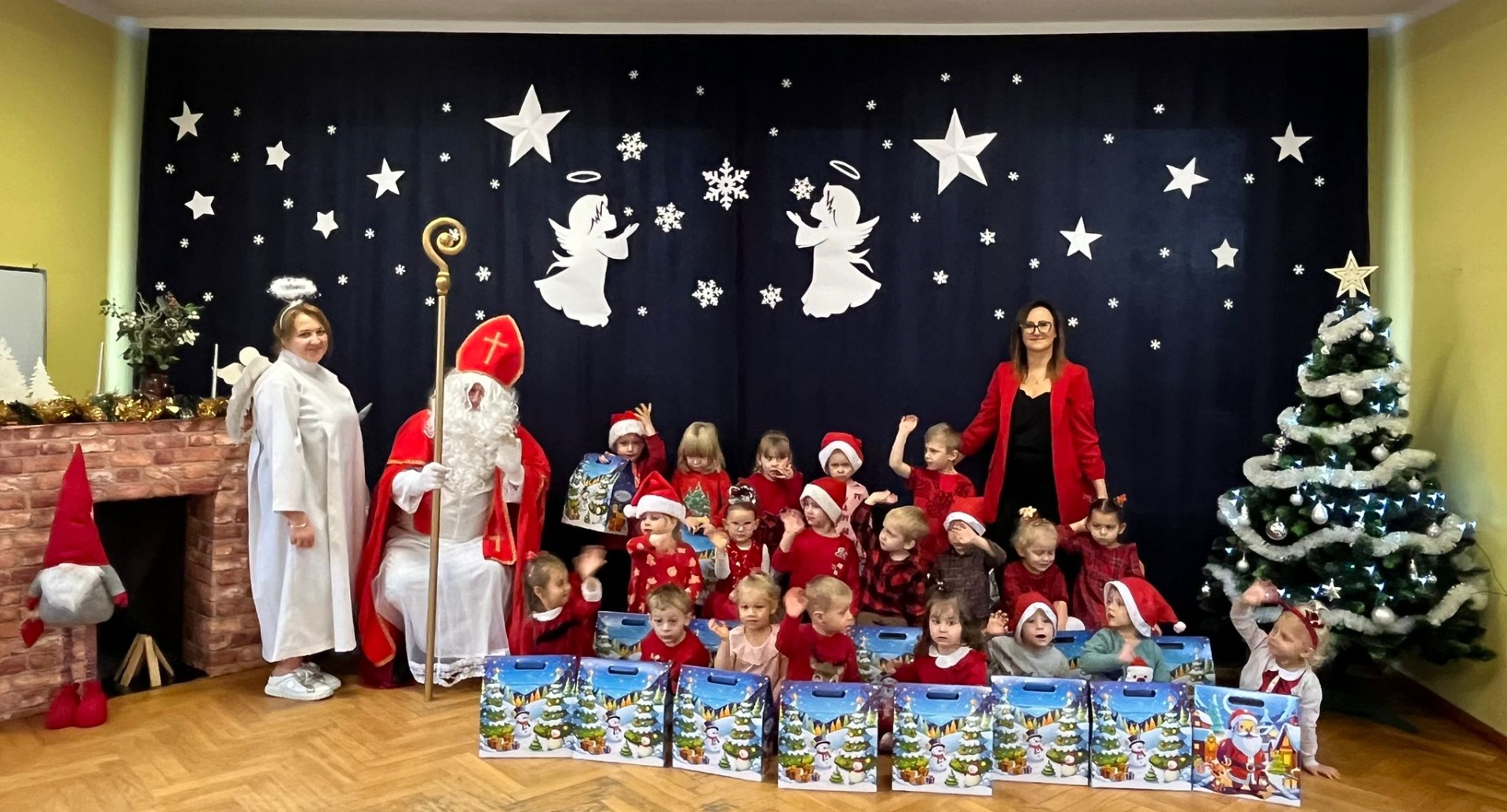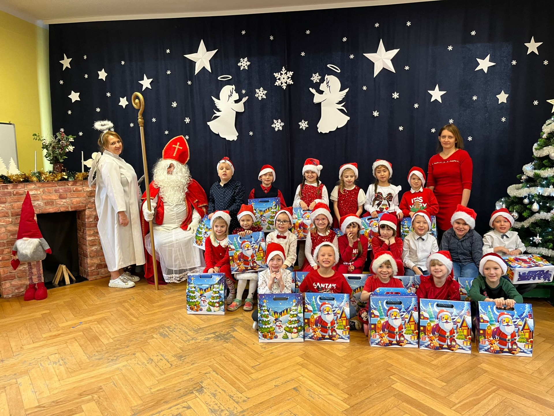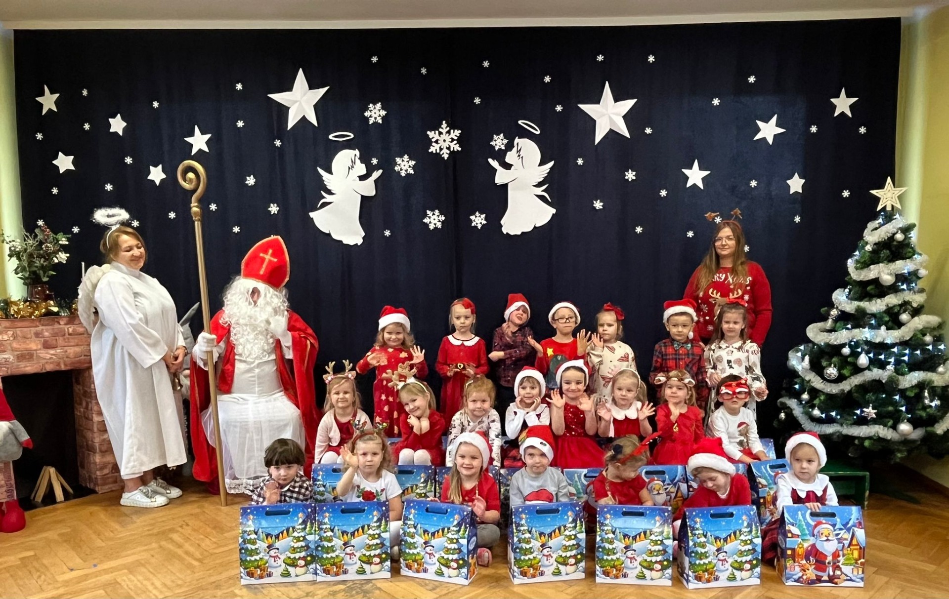 Grupa 5-6latków w imieniu wszystkich przedszkolaków podziękowała Mikołajowi za wizytę w rytm świątecznych utworów. Na koniec wszyscy uczestnicy zrobili pamiątkowe zdjęcie z Mikołajem. Jednak tego dnia czekała na dzieci jeszcze jedna niespodzianka. Burmistrz Woźnik Michał Aloszko ufundował dla każdego przedszkolaka upominek z okazji mikołajek. Dziękujemy serdecznie.