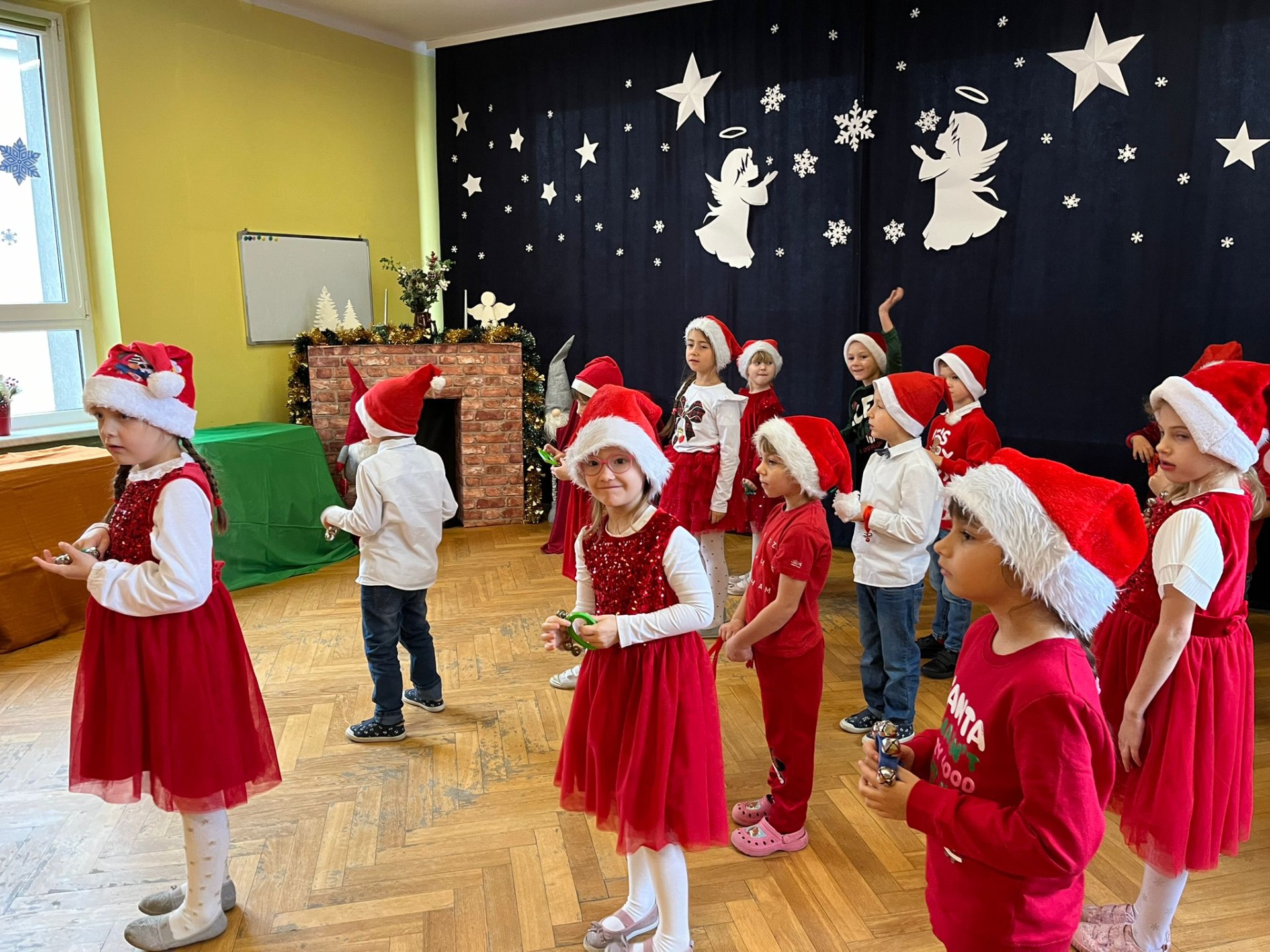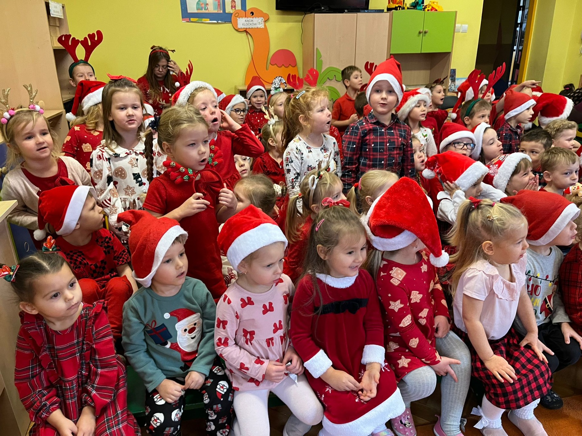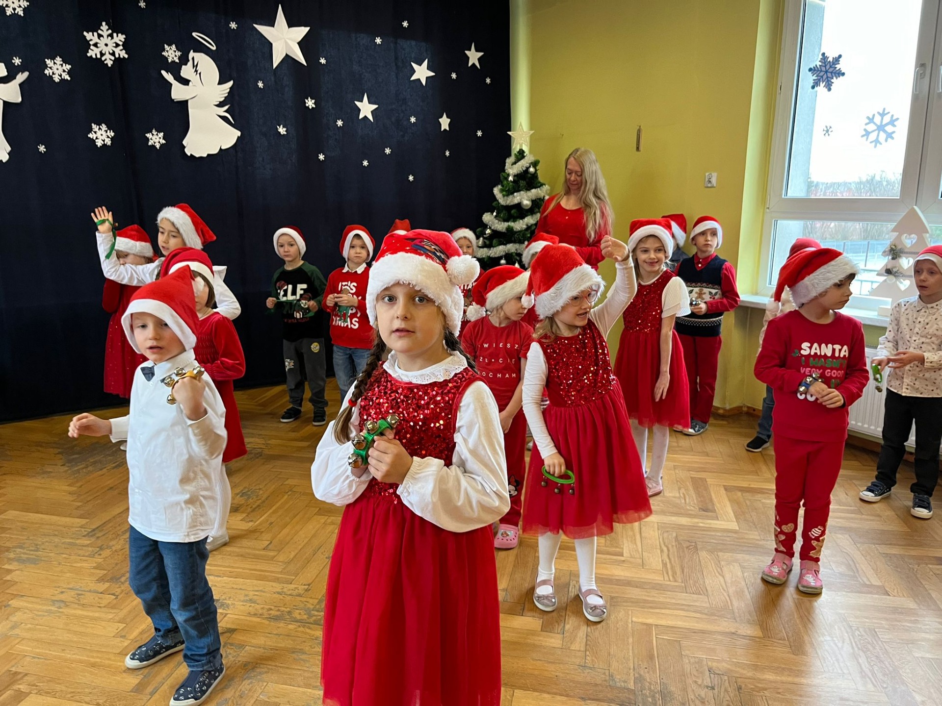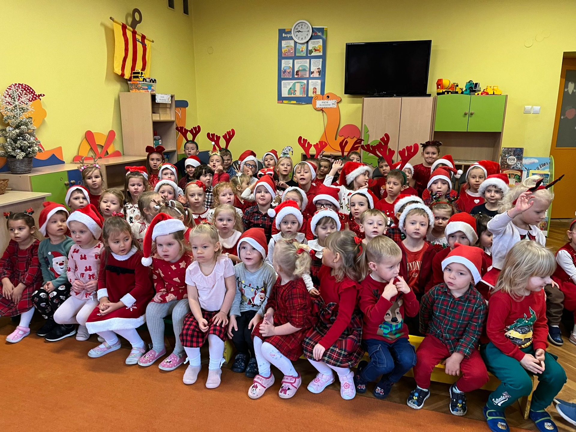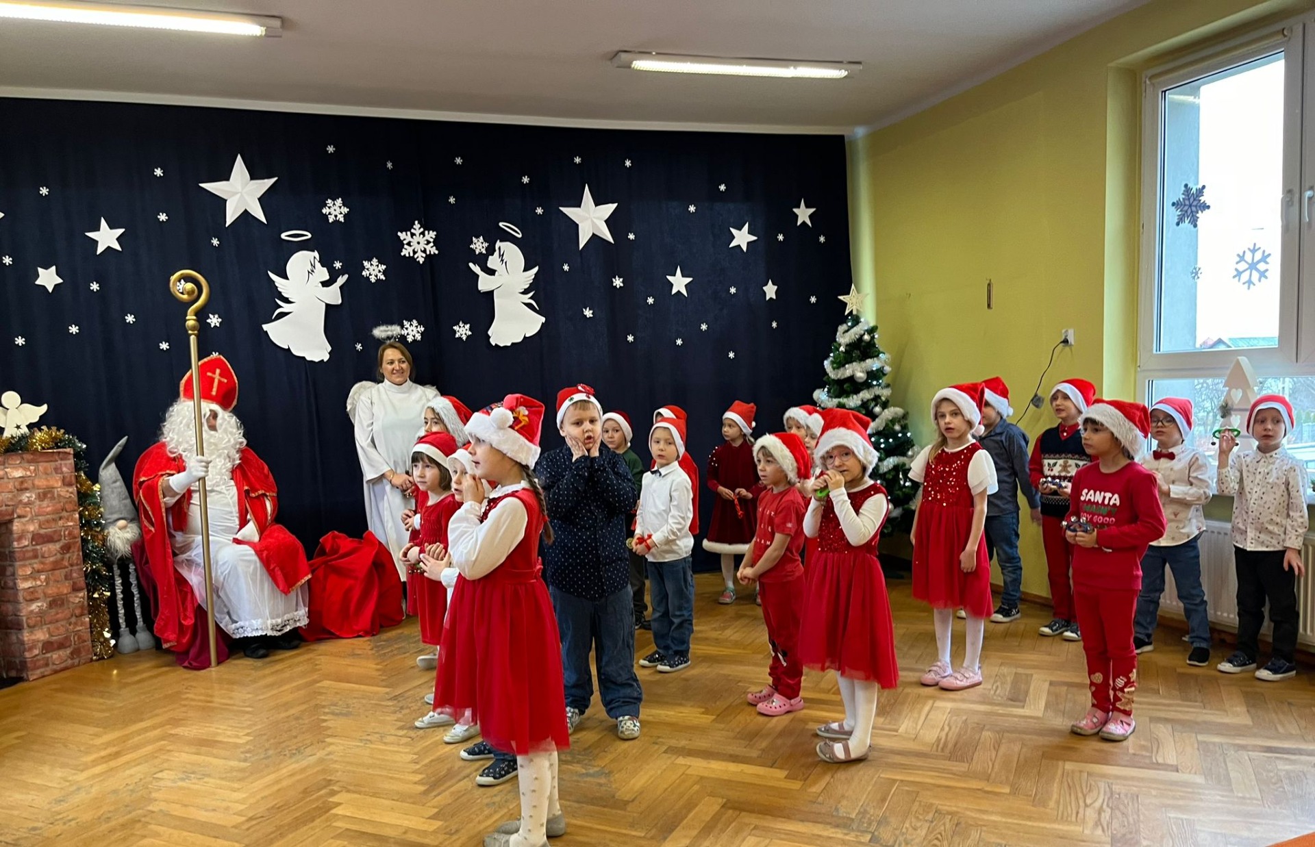 Grupa 5-6latków w imieniu wszystkich przedszkolaków podziękowała Mikołajowi za wizytę w rytm świątecznych utworów. Na koniec wszyscy uczestnicy zrobili pamiątkowe zdjęcie z Mikołajem. Jednak tego dnia czekała na dzieci jeszcze jedna niespodzianka. Burmistrz Woźnik Michał Aloszko ufundował dla każdego przedszkolaka upominek z okazji mikołajek. Dziękujemy serdecznie.