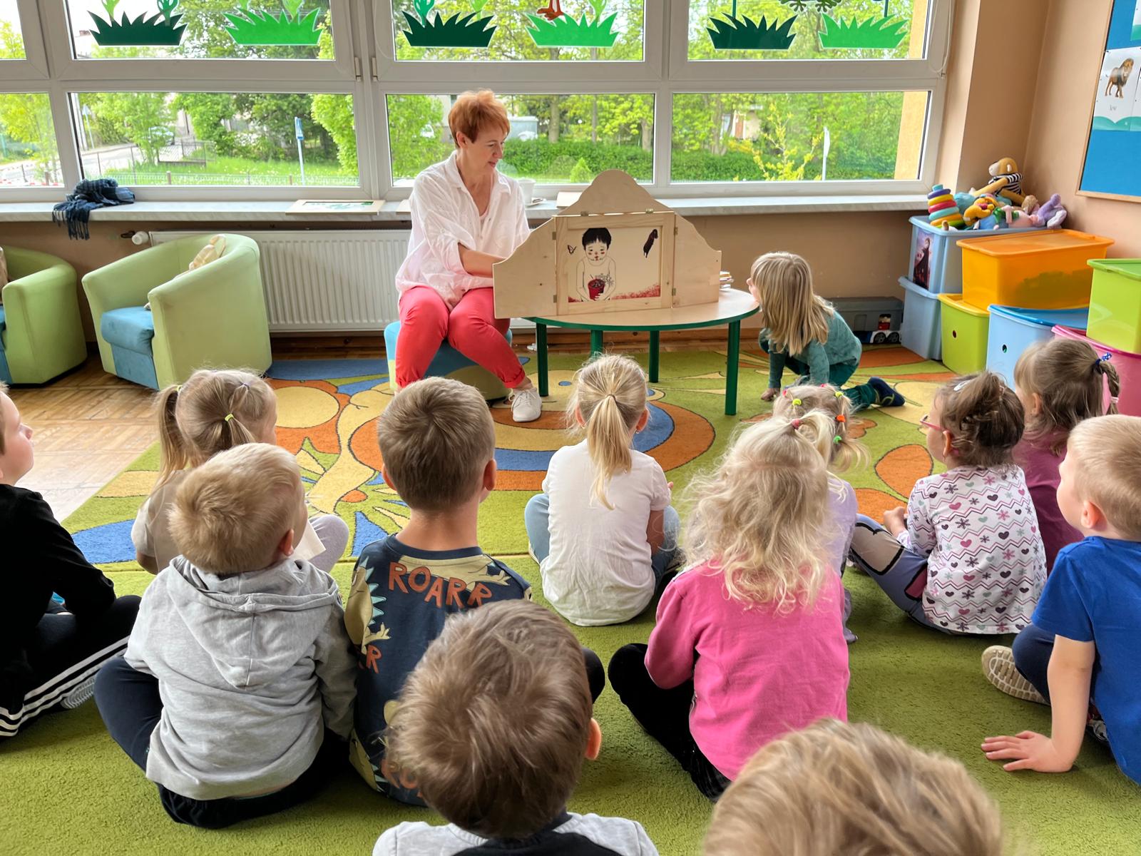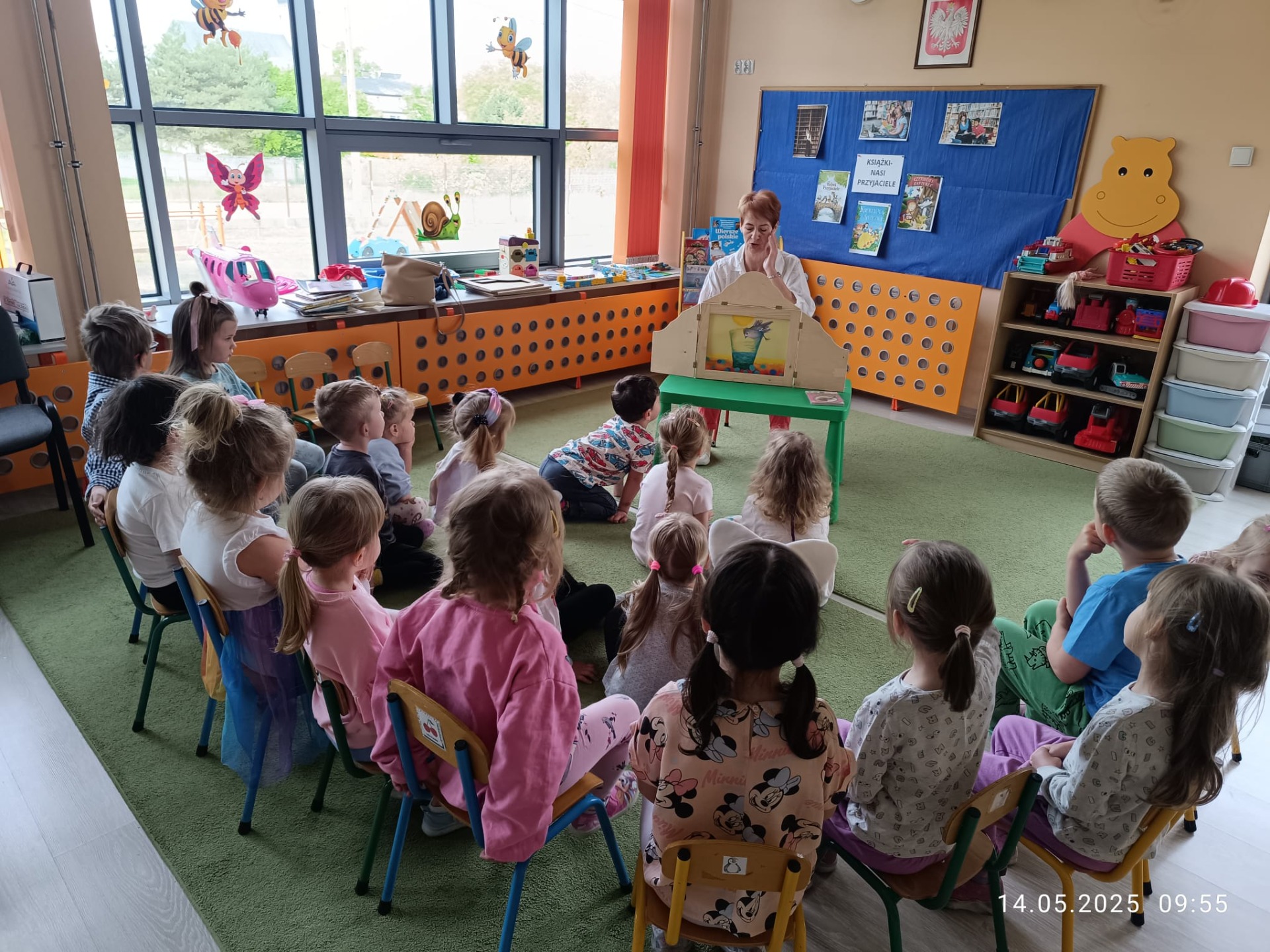Przyniosła ze sobą kilka ciekawych, kolorowych książeczek, które przedszkolaki chętnie oglądały, rozmawiały również z Panią bibliotekarką o swoich ulubionych książeczkach oraz podzieliły się wiedzą na temat tego, jak i dlaczego należy szanować książki. Na zakończenie spotkania dzieci wysłuchały czytanych przez panią Iwonę bajek jak i zobaczyły teatrzyk kamishibai.