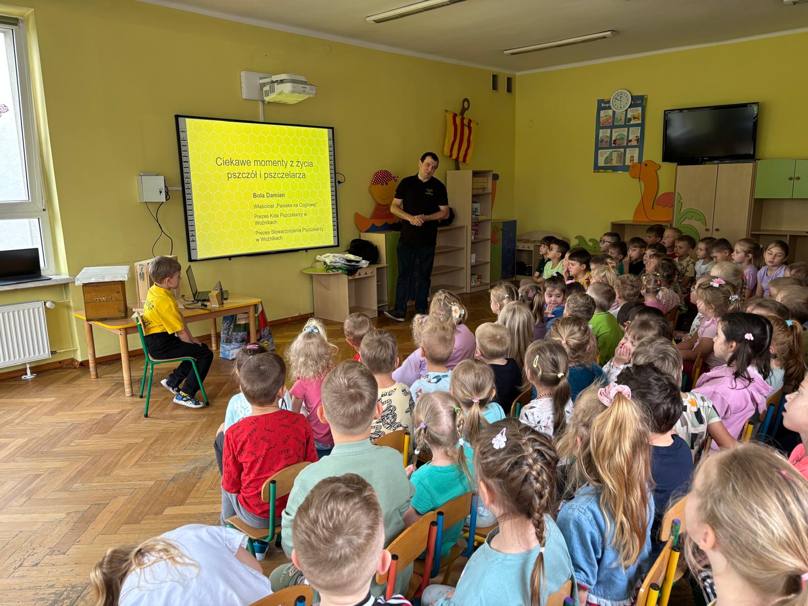 W dniu 20.05.2024r. obchodziliśmy: DZIEŃ PSZCZÓŁ z tej okazji odwiedził nas Prezes Koła Pszczelarzy w Woźnikach Pan Damian Bola.