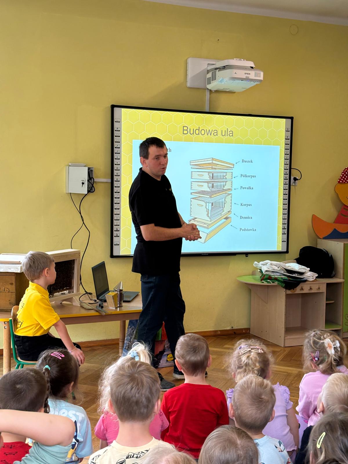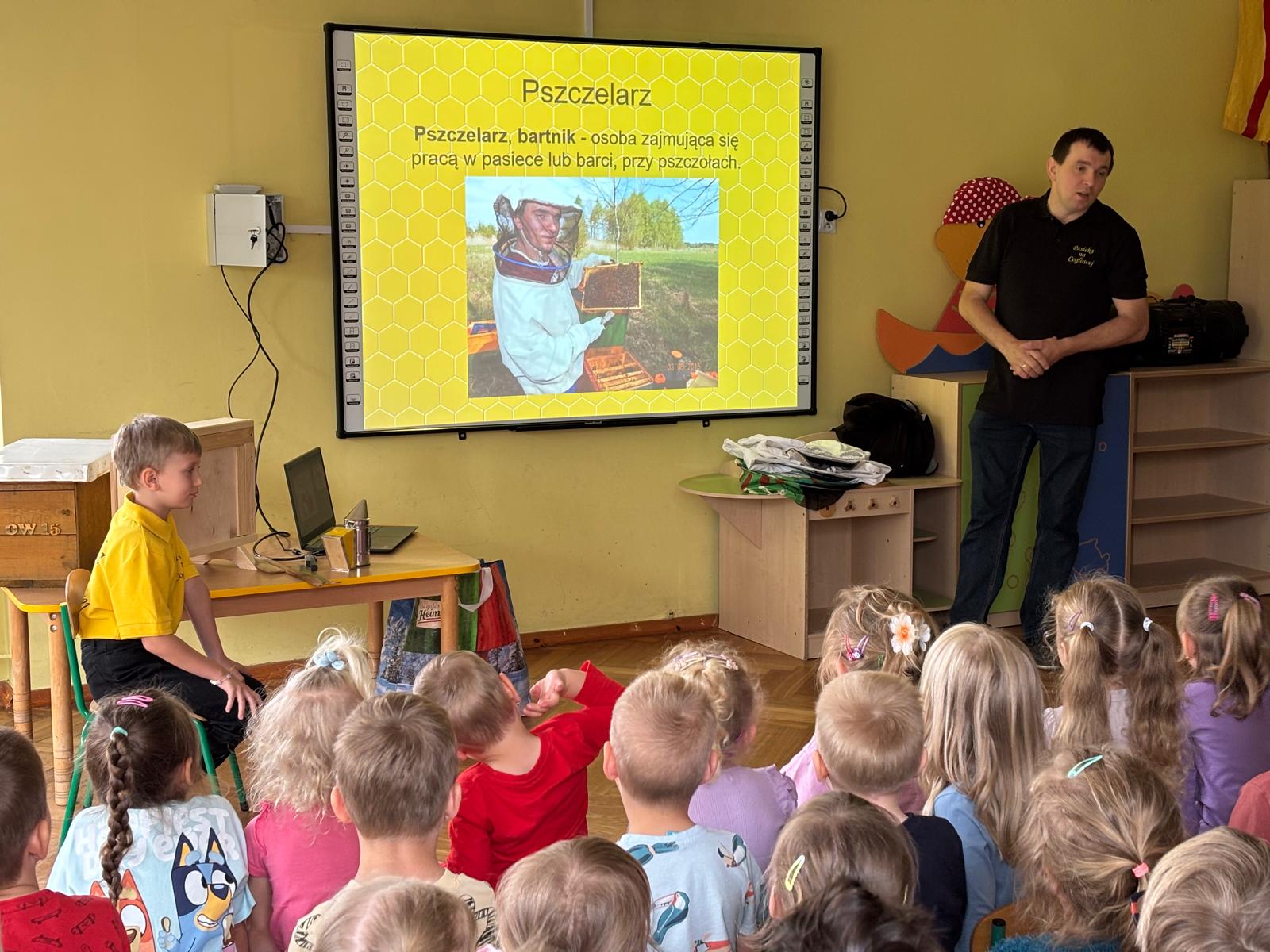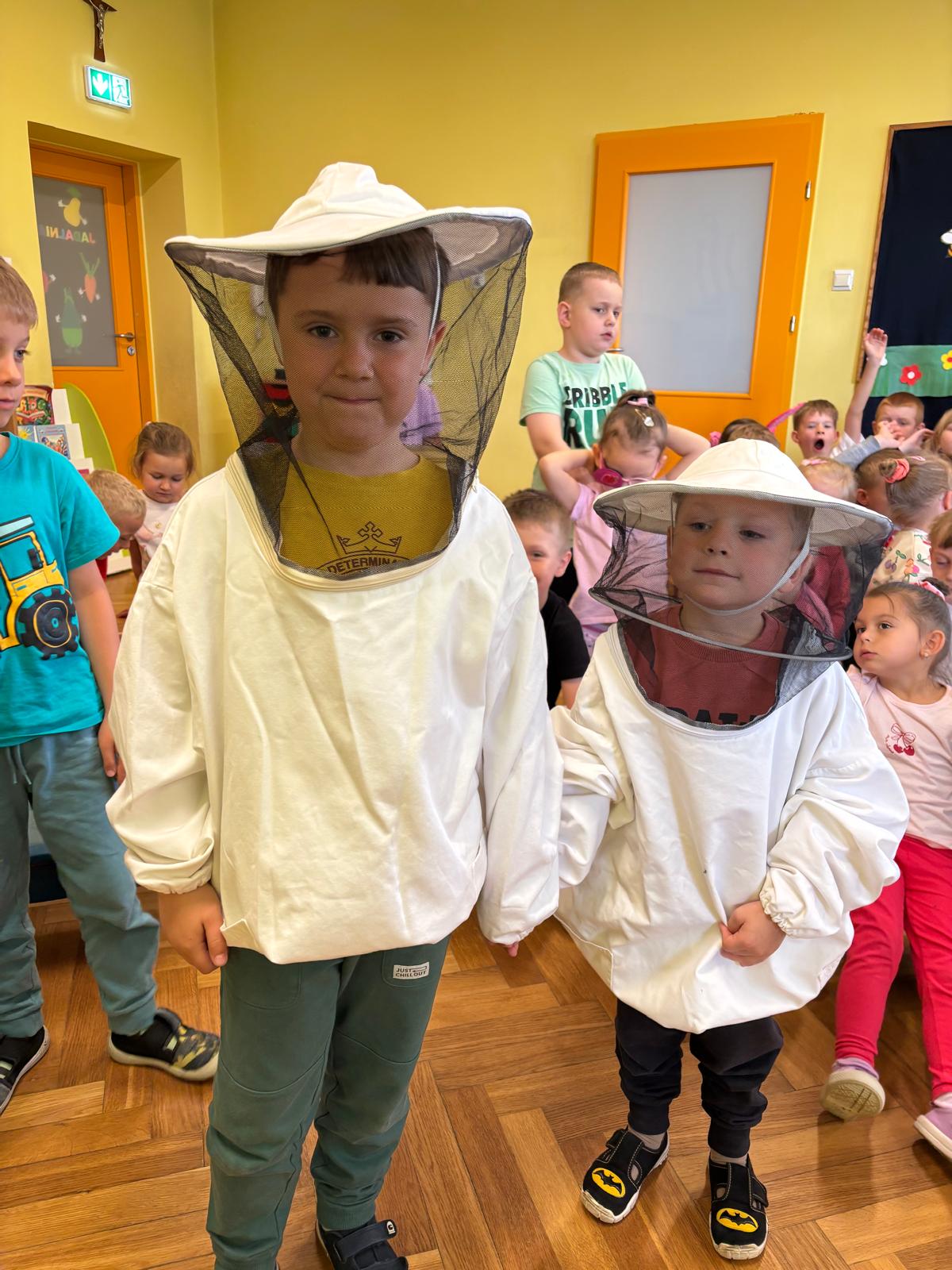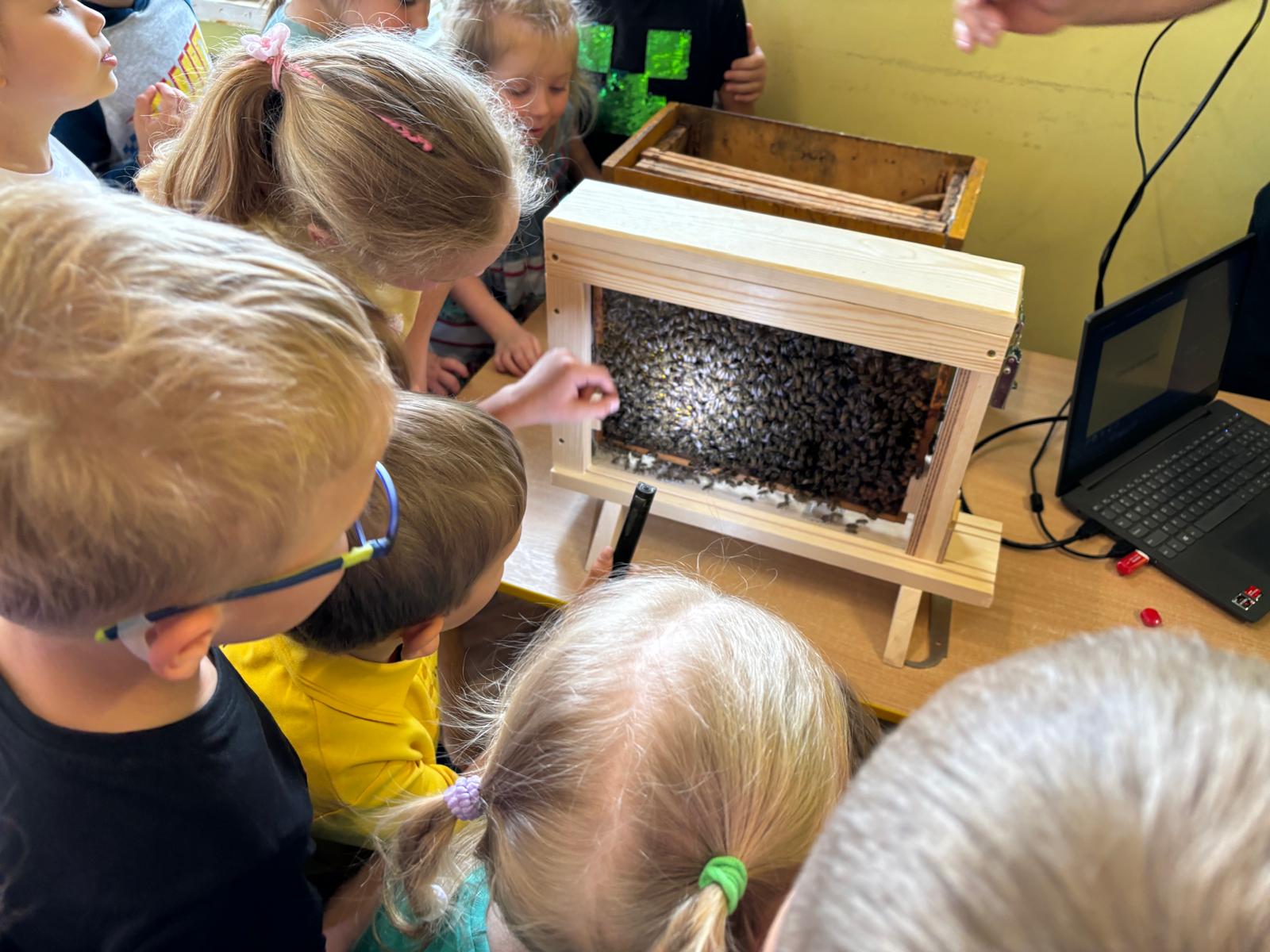 Dzieci miały możliwość poznać życie pszczół oraz produkcję miodu. Pan pszczelarz wraz z synem Dominikiem przybył z wieloma atrybutami potrzebnymi do zbioru miodu. Były pszczoły, stroje pszczelarzy, podkurzacz. Przedszkolaki poznały wiele ciekawostek z życia pszczół, ich fascynujący świat, a przede wszystkim mogły podziwiać je na żywo. Dzieci poznały etapy rozwoju pszczoły, dowiedziały się, jaką rolę w ulu pełni królowa, robotnice, kim jest truteń…, jak i gdzie pszczoły przenoszą pyłek kwiatowy oraz jak powstaje miód. Przedszkolaki miały możliwość zobaczenia niektórych narzędzi niezbędnych w pracy pszczelarza, chętne dzieci mogły nawet wcielić się w jego rolę przymierzając ubranie zakładane przed wejściem do pasieki.