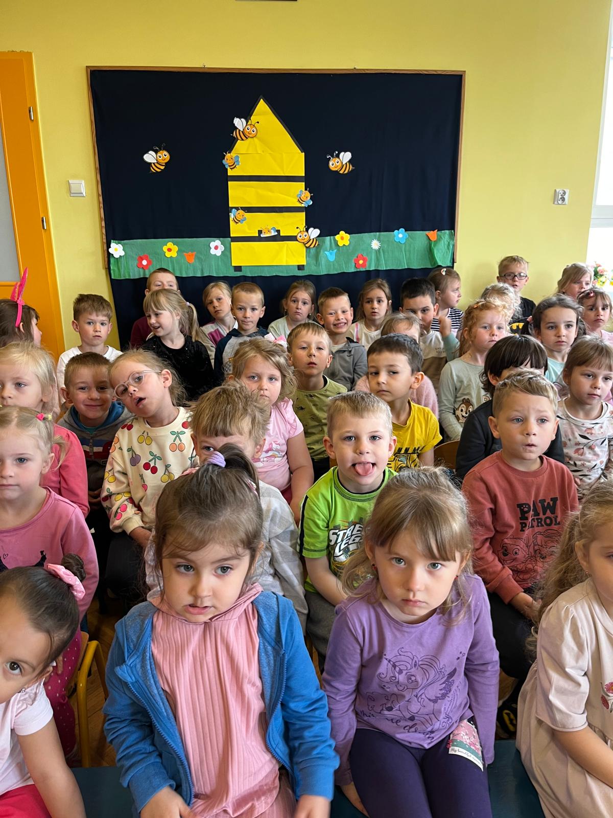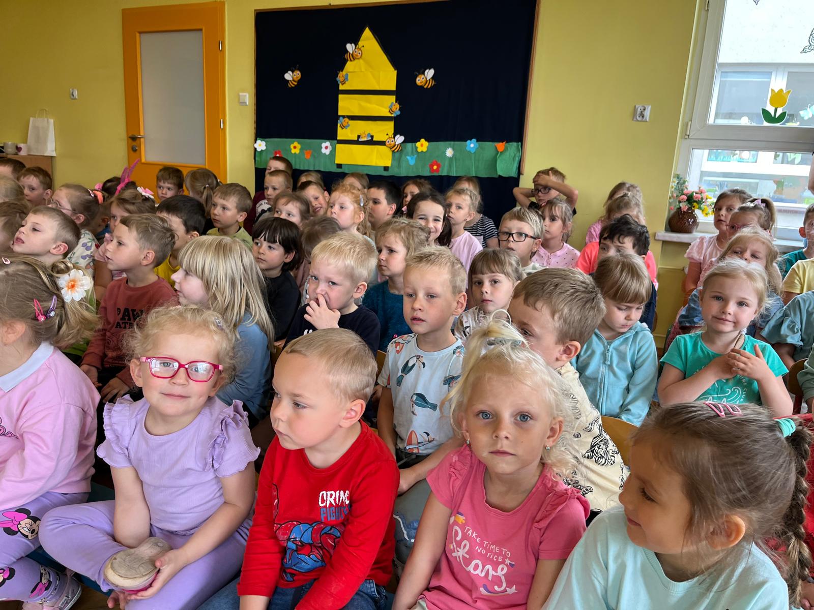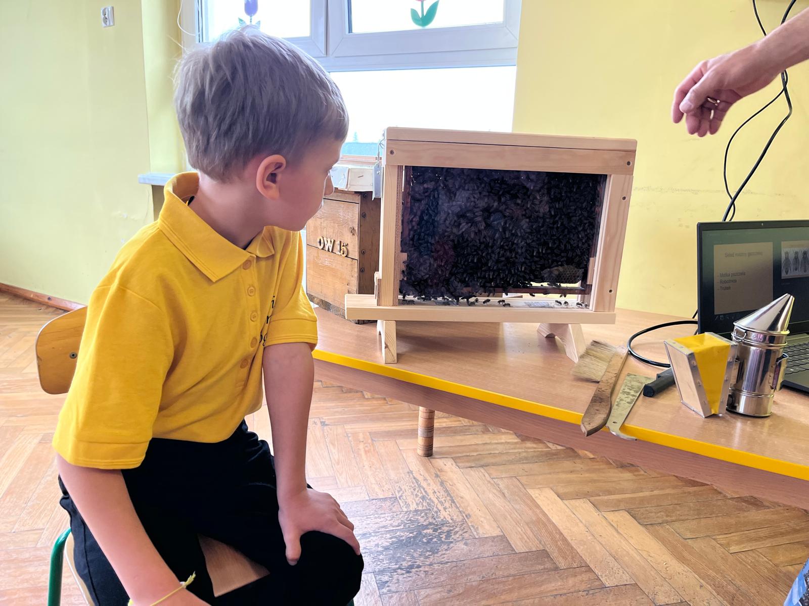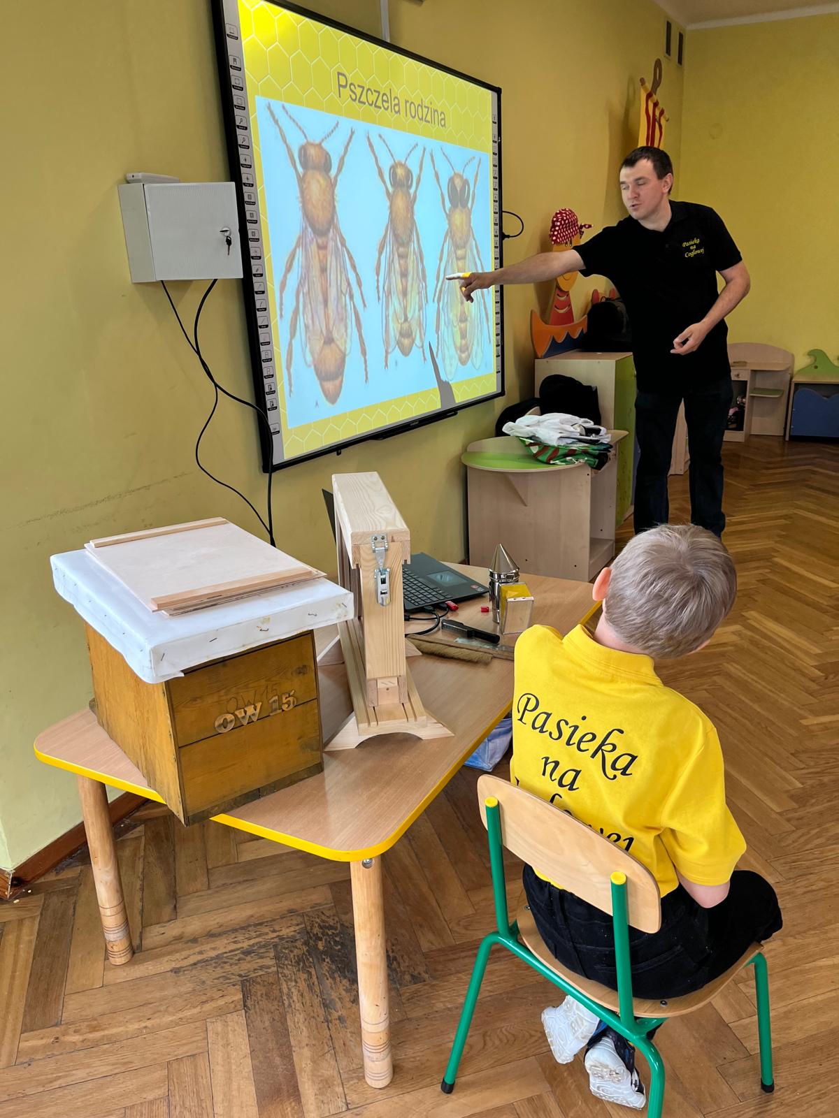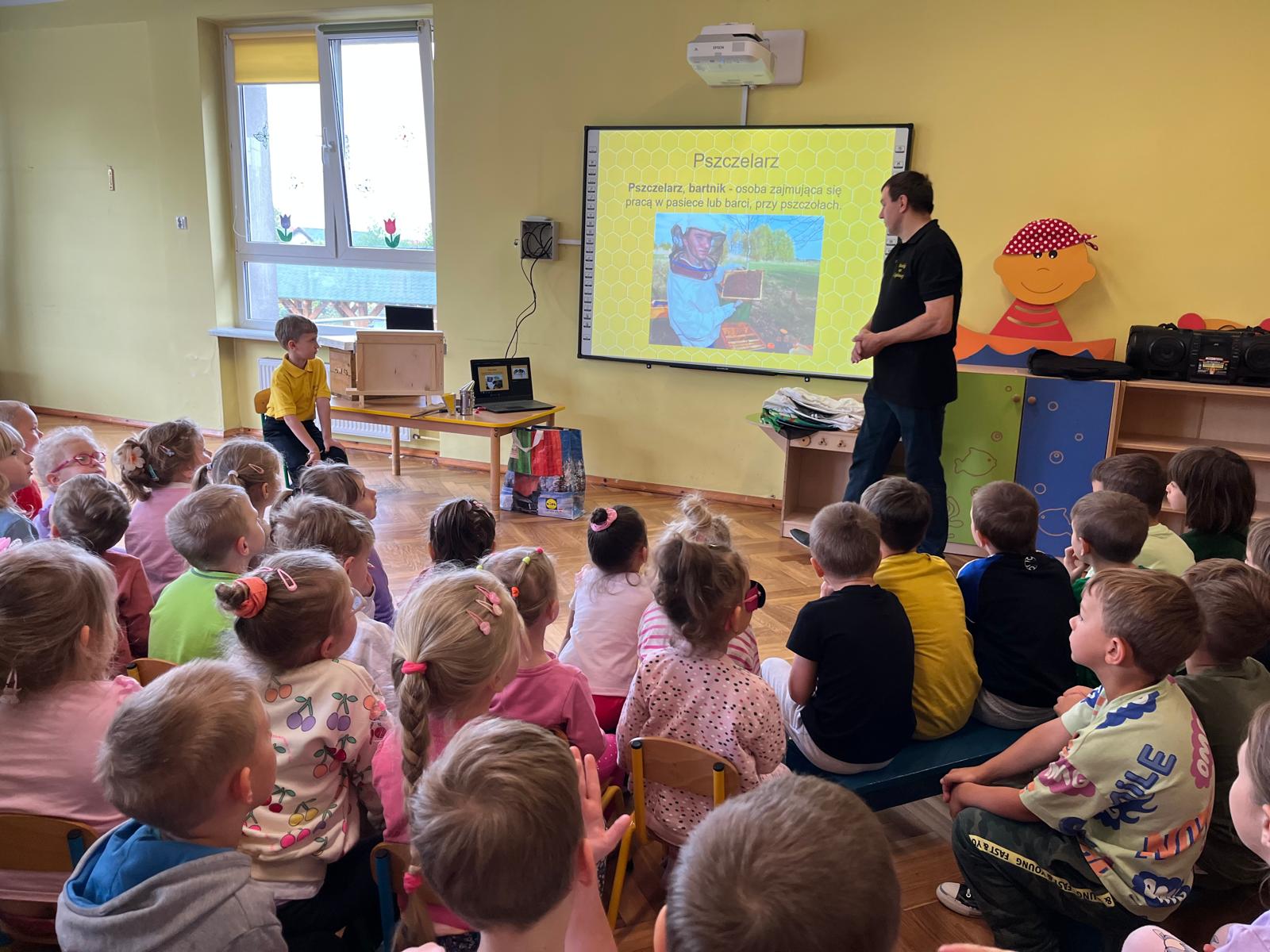 Dzieci miały możliwość poznać życie pszczół oraz produkcję miodu. Pan pszczelarz wraz z synem Dominikiem przybył z wieloma atrybutami potrzebnymi do zbioru miodu. Były pszczoły, stroje pszczelarzy, podkurzacz. Przedszkolaki poznały wiele ciekawostek z życia pszczół, ich fascynujący świat, a przede wszystkim mogły podziwiać je na żywo. Dzieci poznały etapy rozwoju pszczoły, dowiedziały się, jaką rolę w ulu pełni królowa, robotnice, kim jest truteń…, jak i gdzie pszczoły przenoszą pyłek kwiatowy oraz jak powstaje miód. Przedszkolaki miały możliwość zobaczenia niektórych narzędzi niezbędnych w pracy pszczelarza, chętne dzieci mogły nawet wcielić się w jego rolę przymierzając ubranie zakładane przed wejściem do pasieki.