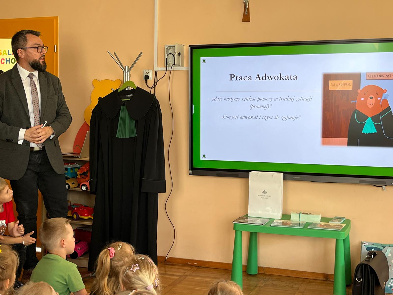W ramach spotkania dzieci dowiedziały się na czym polega praca adwokata oraz zobaczyły jak wygląda strój urzędowy adwokata czyli toga.