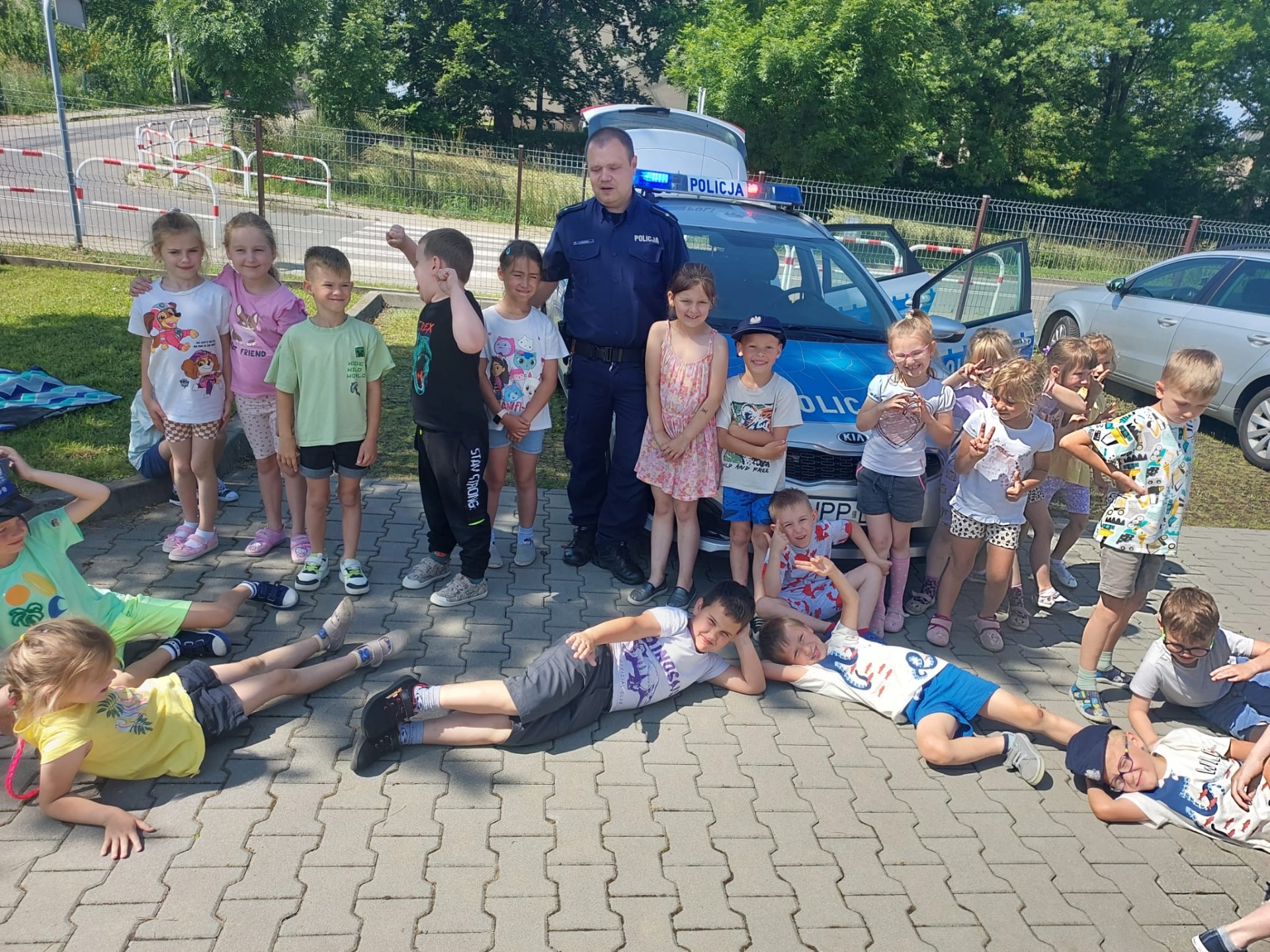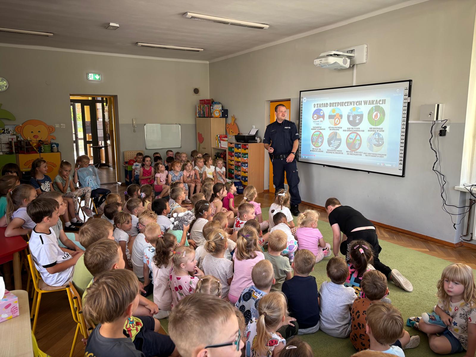 Przed wakacjami koniecznie należy przypomnieć sobie zasady bezpieczeństwa. Nasze przedszkolaki zrobiły to podczas spotkania z funkcjonariuszem policji. Dzieci utrwaliły sobie zasady bezpiecznego poruszania się po drodze, przypomniały kolory i znaczenie świateł sygnalizatora oraz oznakowanie przejścia dla pieszych. Nie zabrakło również kilku słów, na temat kontaktów z obcymi i konieczności zachowania ostrożności. Pan policjant przypomniał także numery alarmowe i sytuacje w jakich należy z nich korzystać.