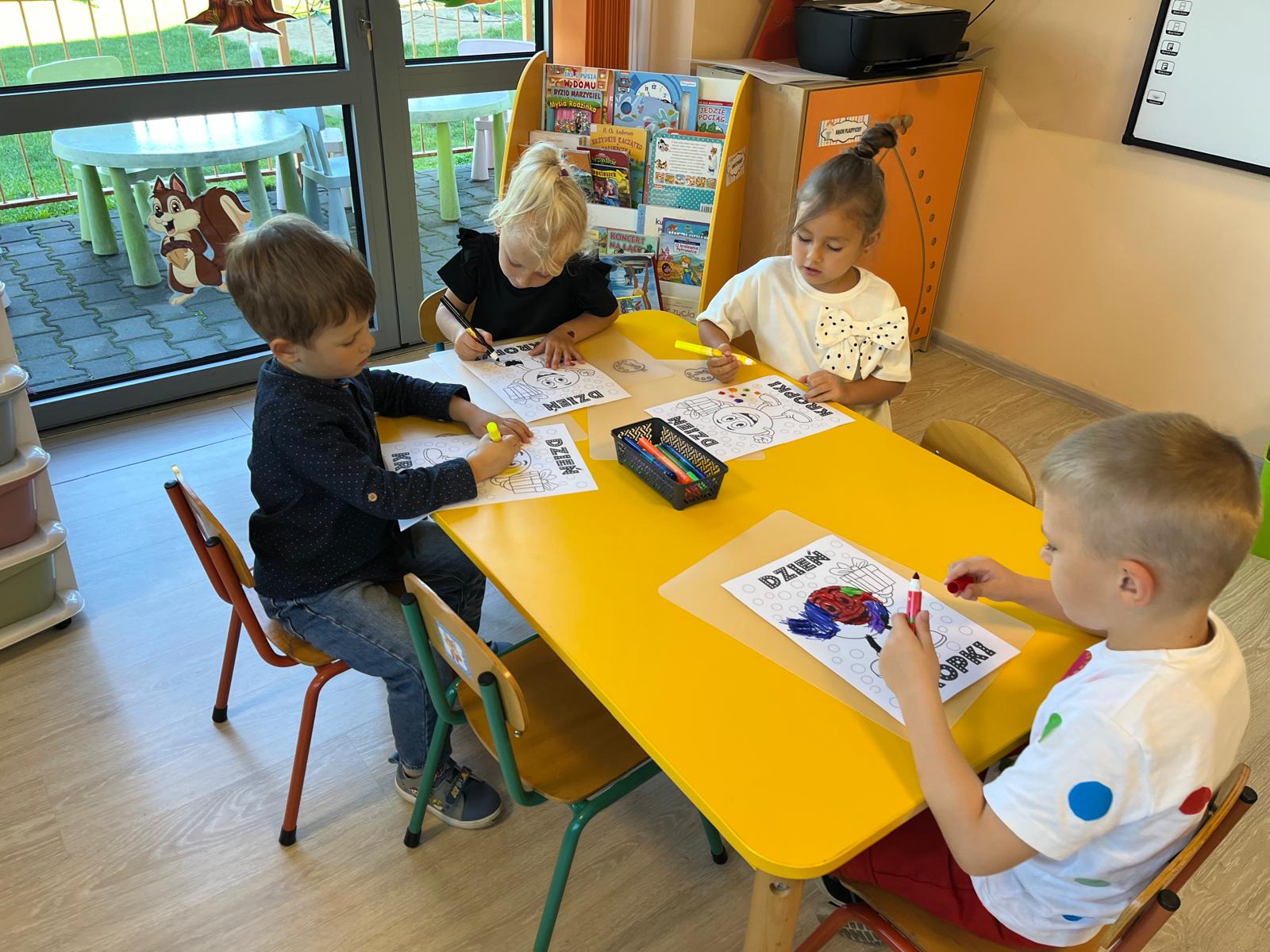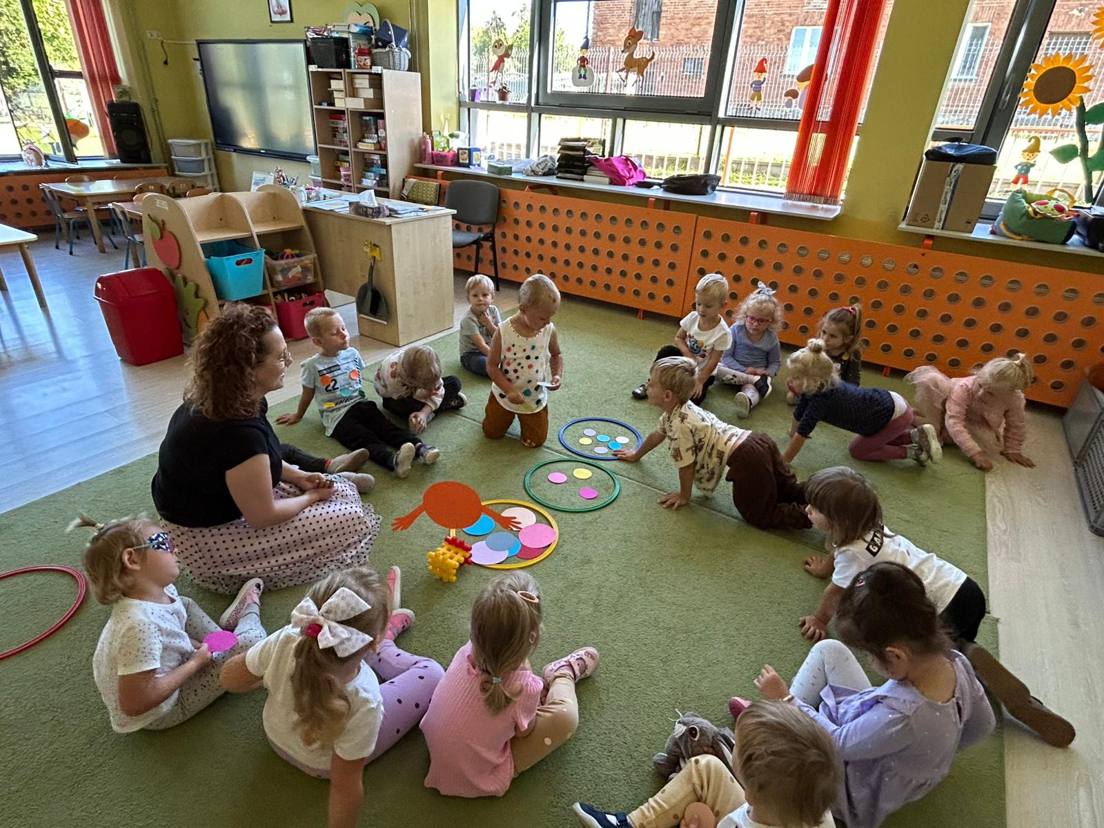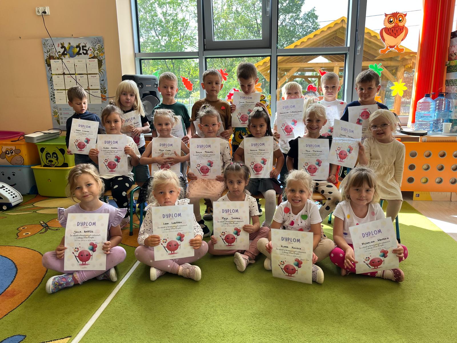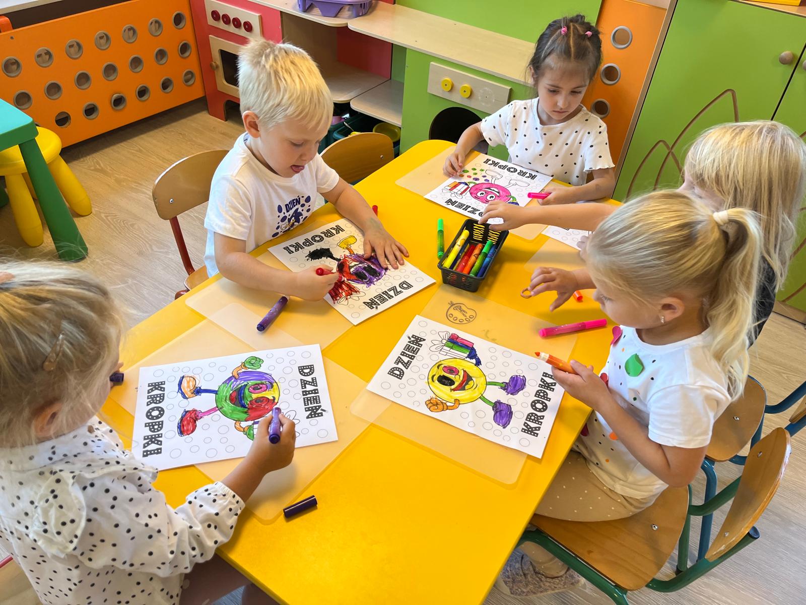 Dzieci tego dnia przystroiły się w kolorowe kropki oraz chętnie uczestniczyły w zabawach i zadaniach, oczywiście z kropką w roli głównej. Wspólnie odkryliśmy, że kropki towarzyszą nam dookoła w naszym codziennym życiu, nawet na naszym ciele i u zwierząt. Dzieci wymyślały co może powstać z kropki, tworzyły ciekawe prace plastyczne. Wspólnie liczyliśmy, segregowaliśmy kolorowe kropki i bawiliśmy się z kropkami przy muzyce.