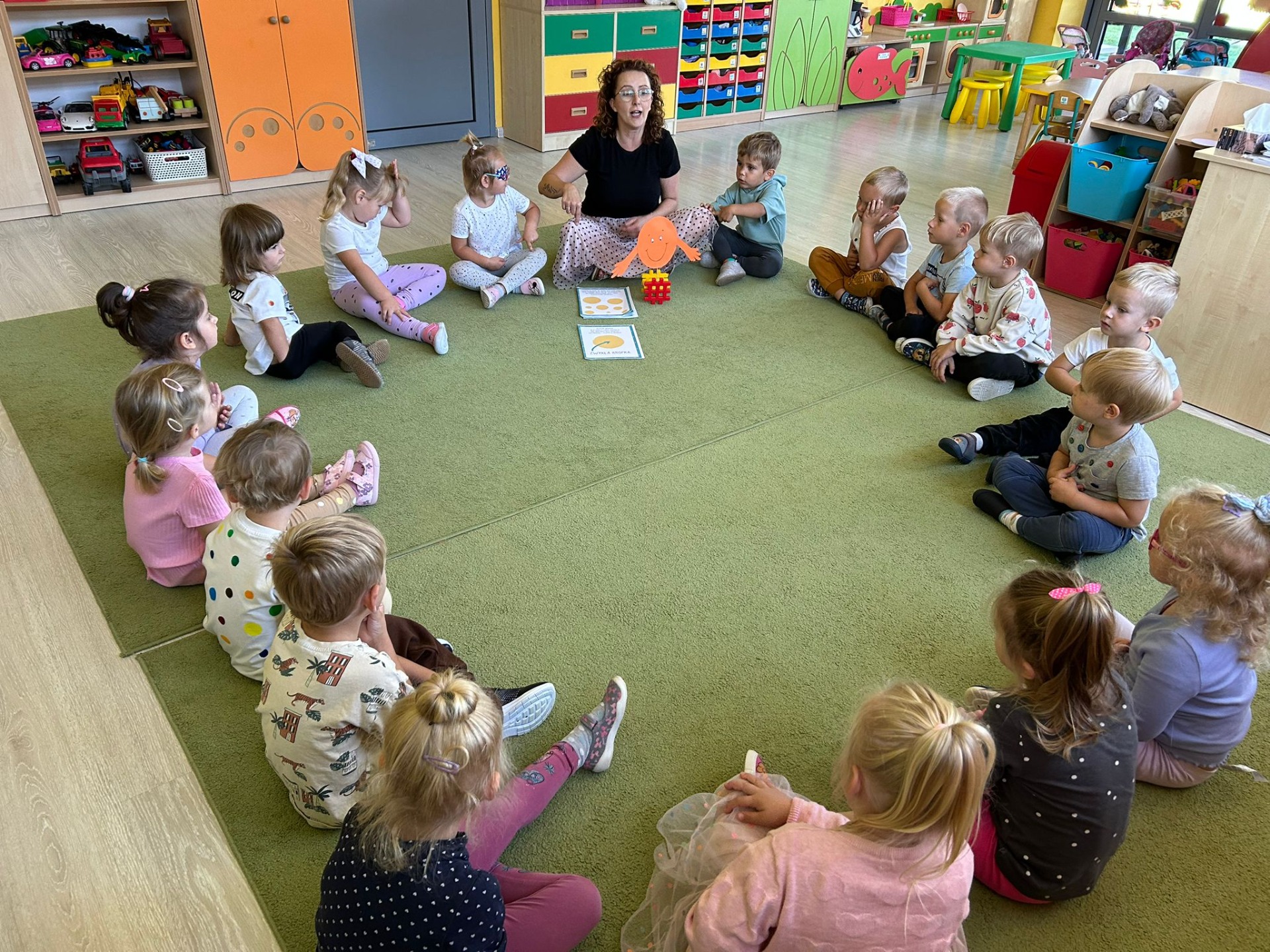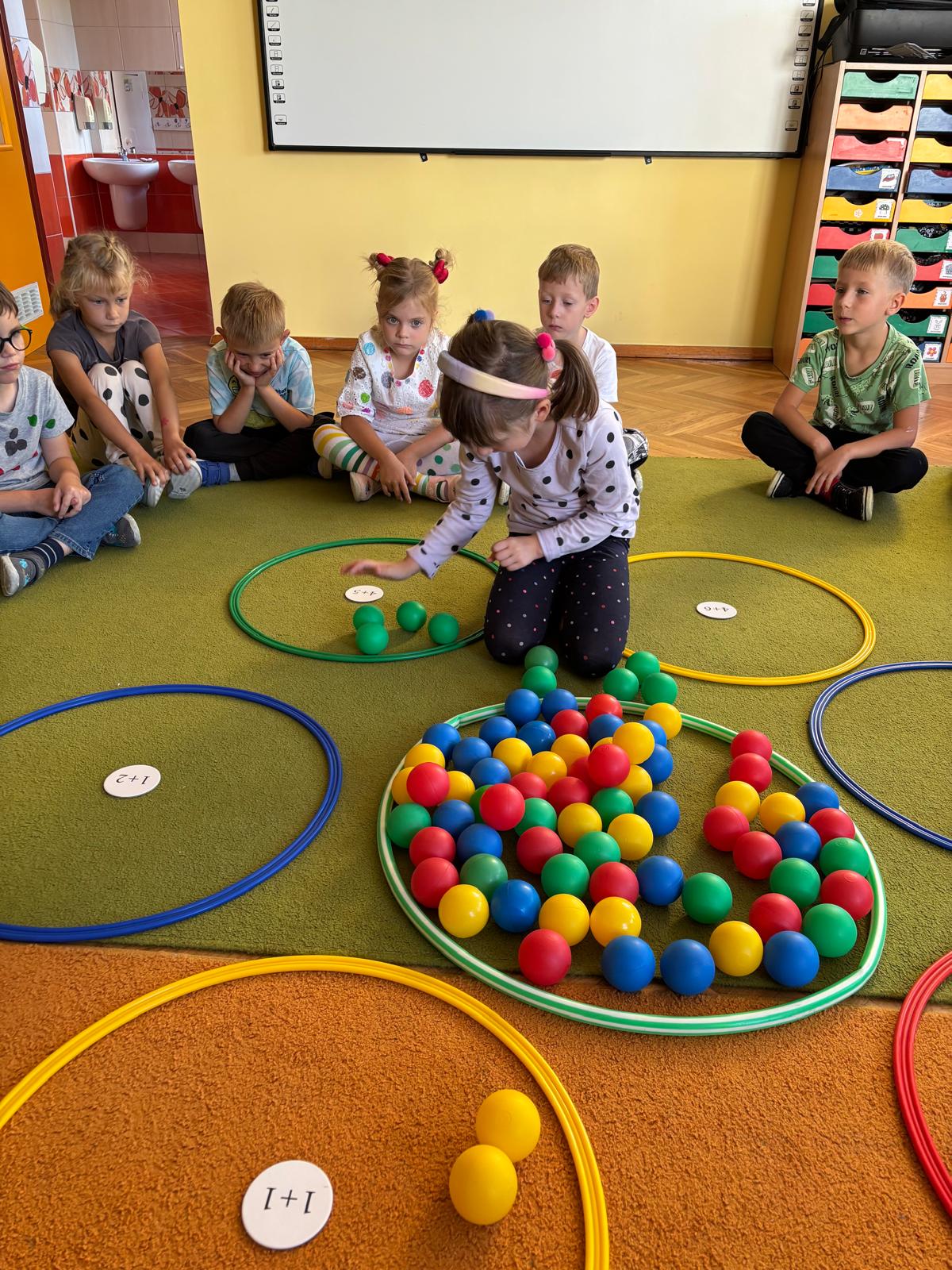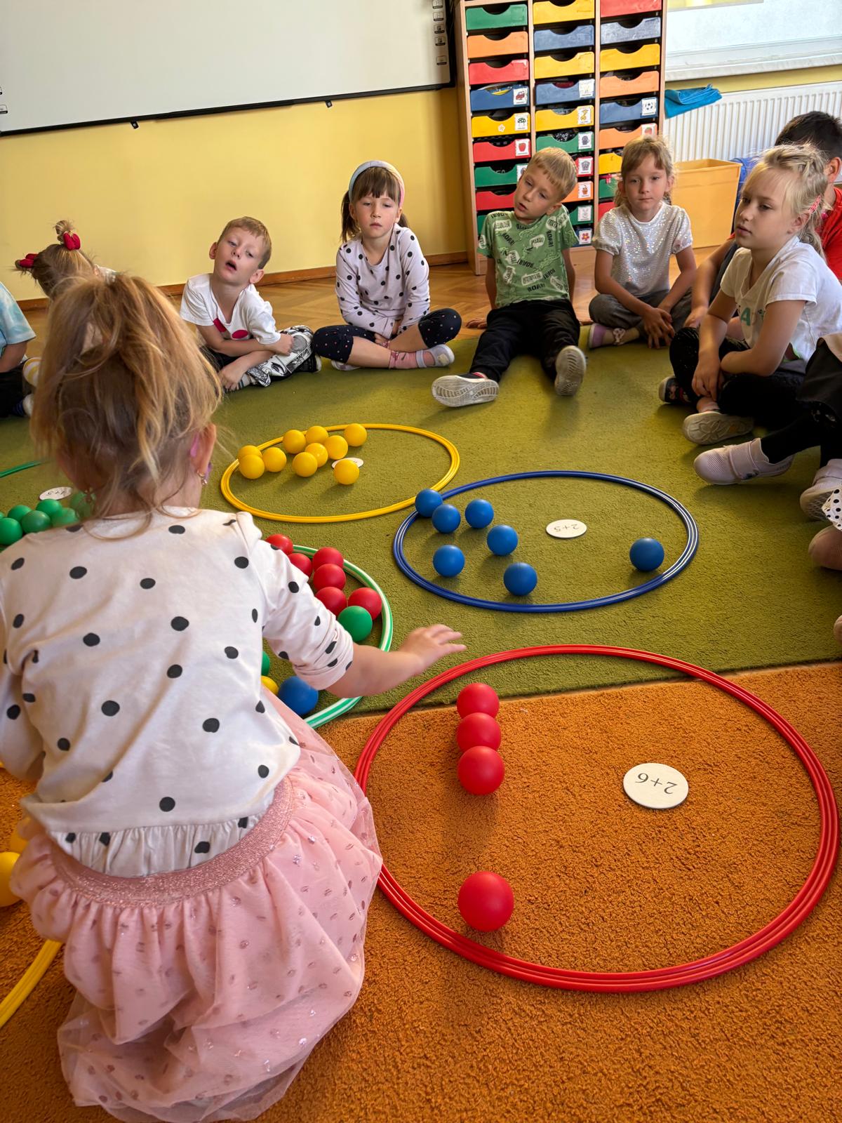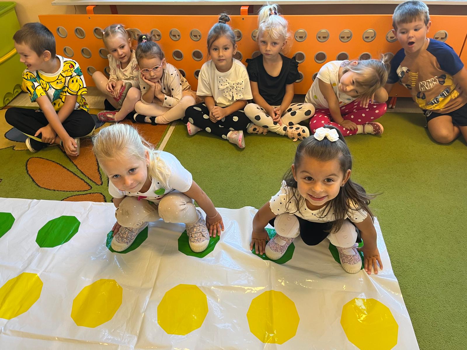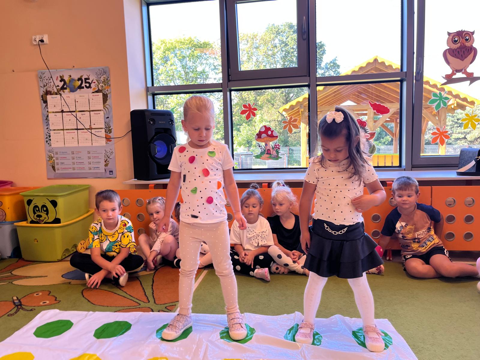 Dzieci tego dnia przystroiły się w kolorowe kropki oraz chętnie uczestniczyły w zabawach i zadaniach, oczywiście z kropką w roli głównej. Wspólnie odkryliśmy, że kropki towarzyszą nam dookoła w naszym codziennym życiu, nawet na naszym ciele i u zwierząt. Dzieci wymyślały co może powstać z kropki, tworzyły ciekawe prace plastyczne. Wspólnie liczyliśmy, segregowaliśmy kolorowe kropki i bawiliśmy się z kropkami przy muzyce.